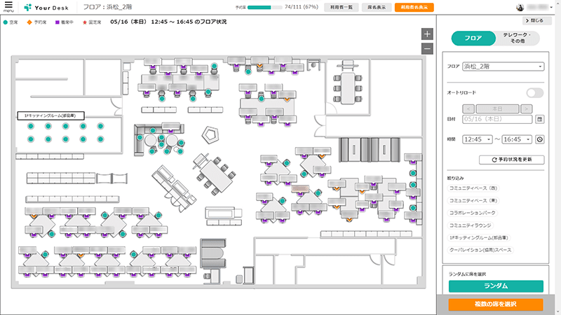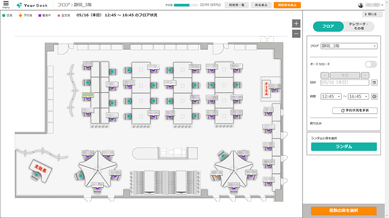 ViCreA 浜松は様々なタイプの座席があります。このフロアは一部固定席ですが、それ以外はフリーアドレスで、その日に座りたい座席を「YourDesk」で選んで利用しています。浜松では1Fのエントランスを入ったところに大きなタッチパネルを設置し、そこに「YourDesk」を表示させています。お客様からは「これなんだろうって思ってたんだよ」と興味を持っていただける事が多いです。